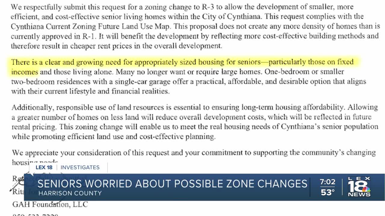 HARRISON COUNTY, Ky. (LEX 18) — Residents at The Cottages at Flat Run, a senior living community in Cynthiana, are grappling with new concerns after their property's owners requested zoning changes that could dramatically alter their neighborhood.