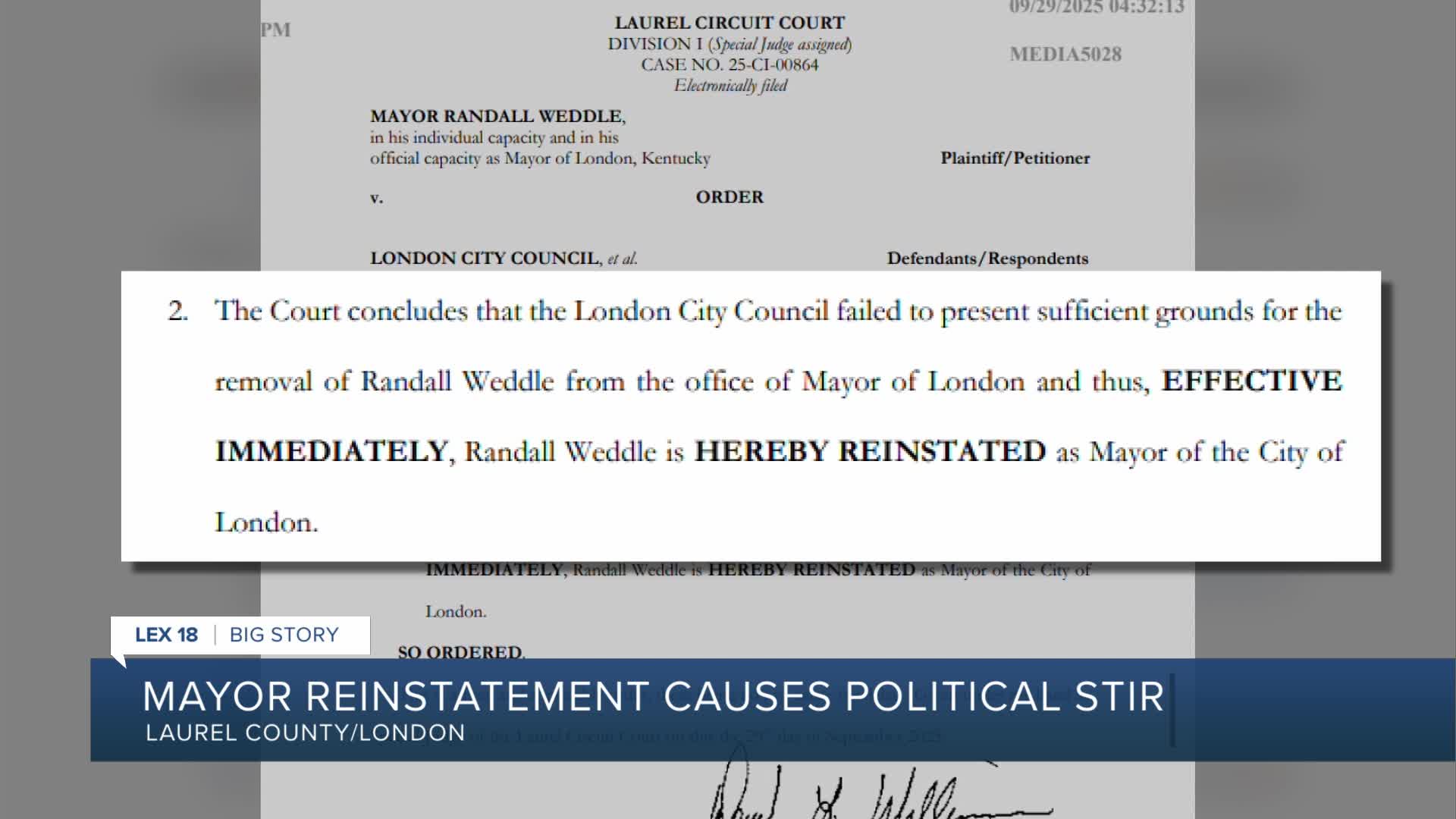 In a document filed on Monday, the Laurel Circuit Court has reinstated Randall Weddle as mayor of London, effective immediately, ruling that the city council failed to present sufficient grounds for his removal from office.