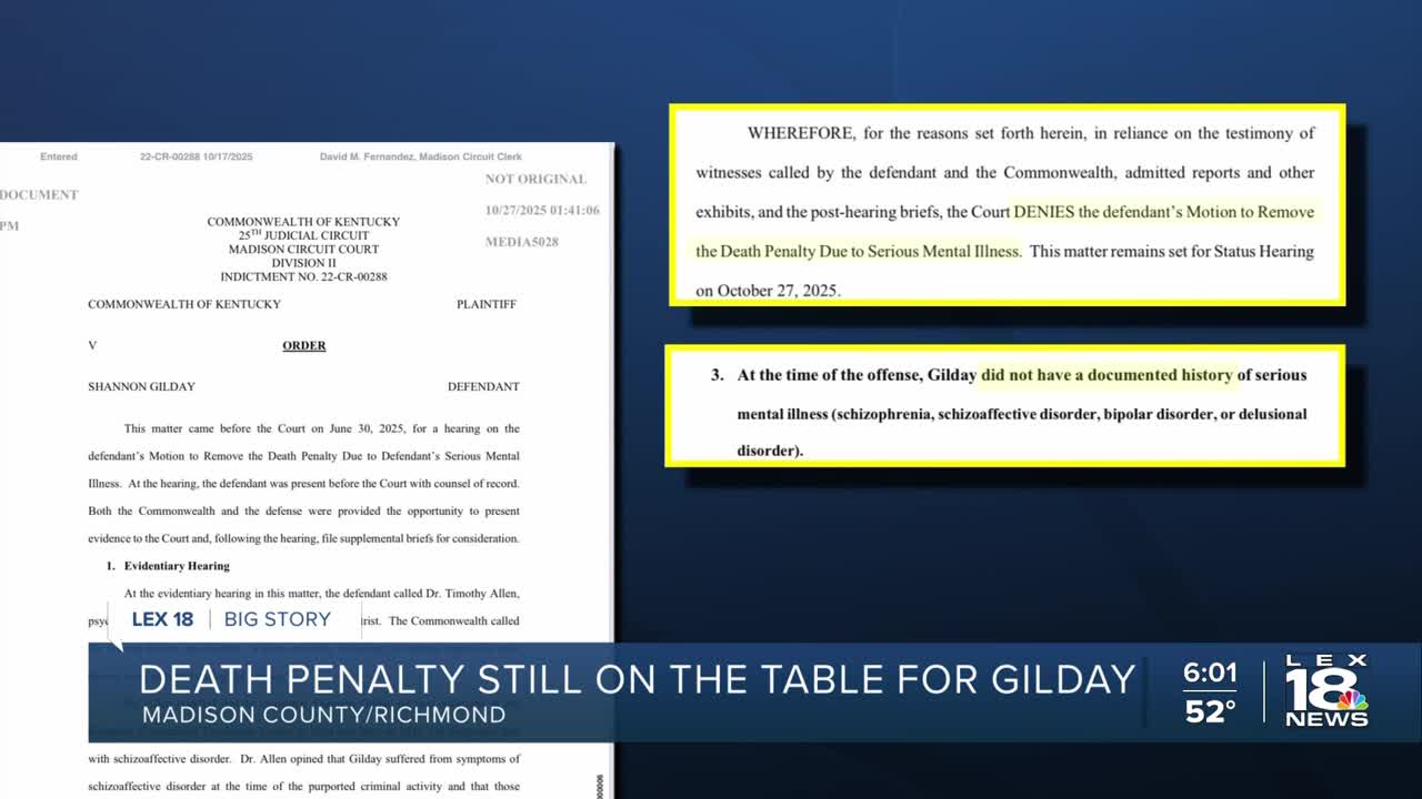 MADISON COUNTY, Ky. (LEX 18) — A Madison County judge has ruled that the death penalty remains an option if Shannon Gilday is convicted in the 2022 killing of Jordan Morgan.