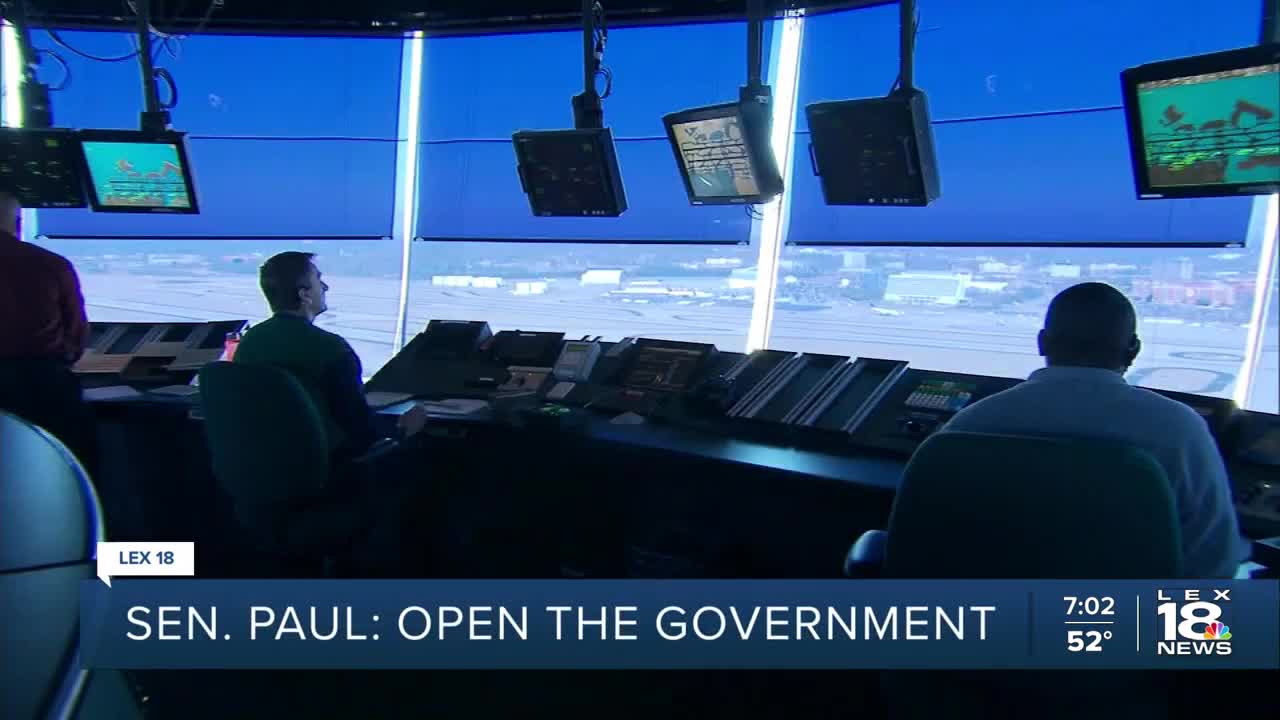 Senator Rand Paul, who has been voting to reopen the government, visited Louisville on Monday and called for immediate action to pay federal employees who are working and restore food assistance to those who need it.