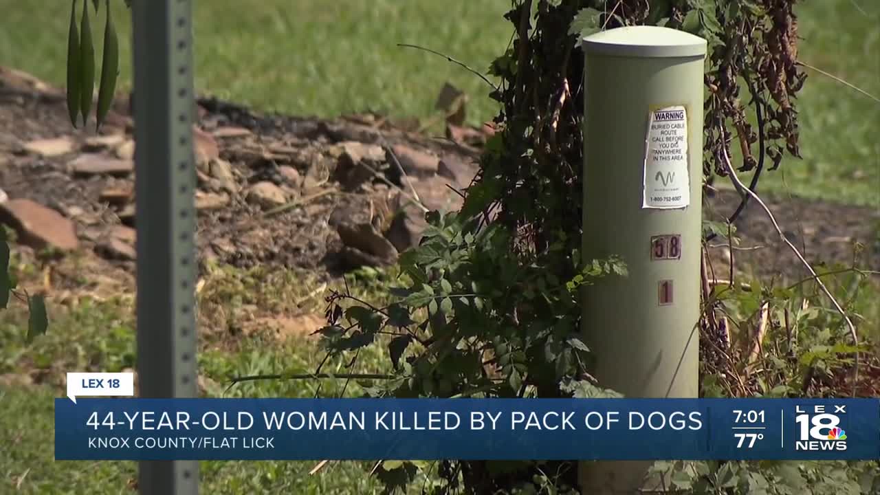 A 44-year-old woman died Friday after being attacked by a pack of dogs while walking in the Flat Lick community, according to the Knox County Sheriff's Office.