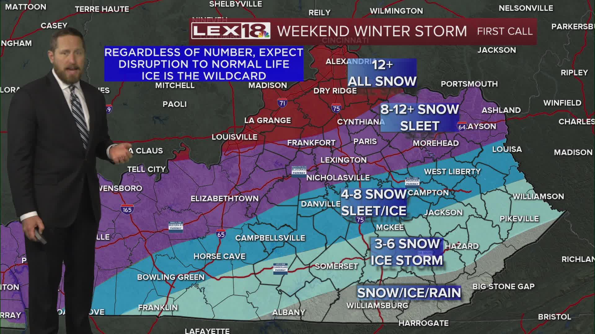 Friday is the calm before the major winter storm that's bearing down on us this weekend. This is the time to prepare and stay weather aware! We'll end up mostly cloudy with highs in the upper 20s in the Bluegrass and low to mid 30s southeast. Arctic air filters in throughout the day on a northerly breeze and we'll drop to the upper single digits overnight with a subzero wind chill. The first round of snow arrives Saturday, mainly in the afternoon with highs in the upper teens to low 20s. Another surge of moisture develops Saturday night into Sunday as low pressure tracks northeast. We'll see everything from moderate to heavy snow in the Bluegrass and northern Kentucky to a mix of snow, sleet and freezing rain as you head south. Expect an absolute mess on the roads, travel will become hazardous if not impossible late in the weekend and with highs likely staying below freezing next week it will be difficult to get rid of and deal with. It will also stay bitterly cold with lows dropping below zero a couple of nights. A winter storm warning is in effect Saturday morning through Monday morning. Snowfall totals will range from over 12" north to lower amounts south due to sleet and freezing rain.