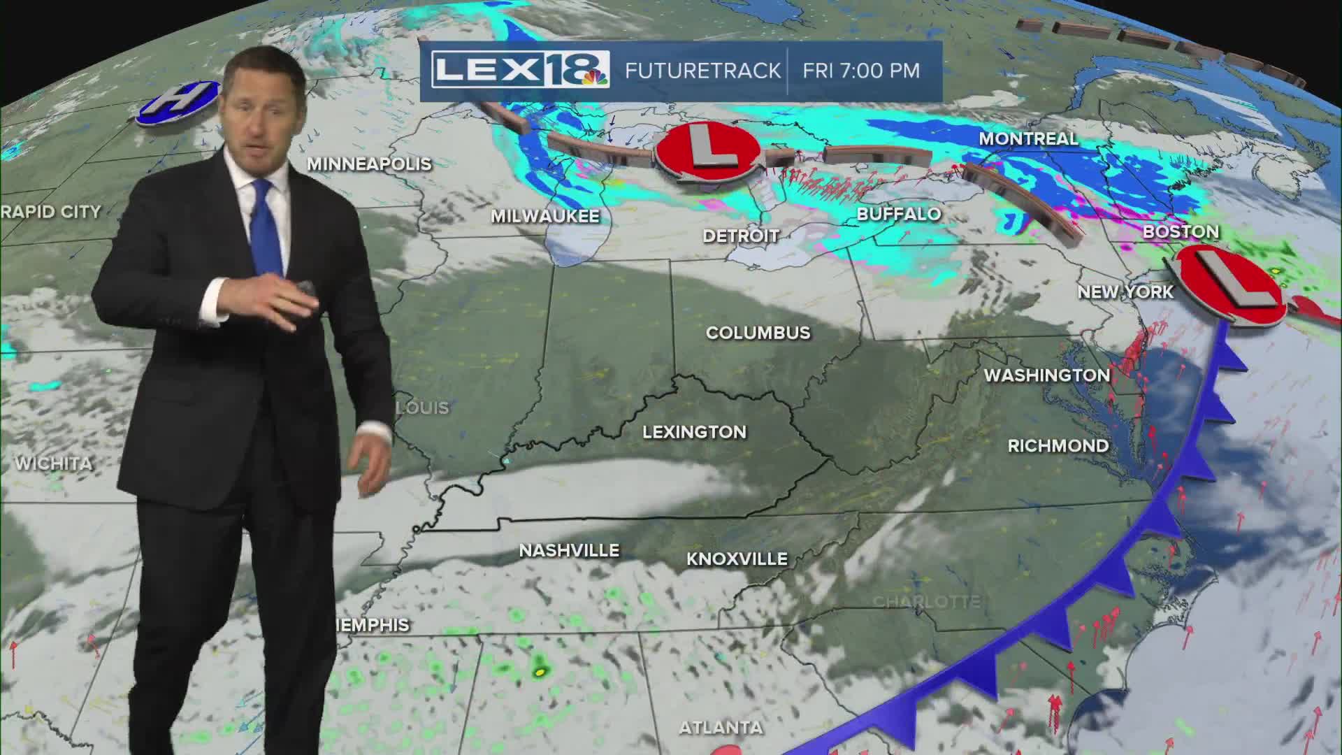 Brace for a gusty and cooler start to what will be a progressively colder weekend ahead. Strong low pressure spinning over the Great Lakes will keep a west/northwest wind flowing, and it will be gusty Friday! Expect 30 to 40 mph gusts throughout the day with plenty of sunshine and highs in the 50s. Low pressure over the deep south will throw clouds and a few showers across southeastern counties Saturday morning; we probably won't see much in the Bluegrass. The big story beyond that is winter's brief return late in the weekend. Highs will bottom out in the 30s Sunday into Monday with a few snow showers and flurries possible to wrap up the weekend! We're back in the 50s with rain showers by the middle of next week.