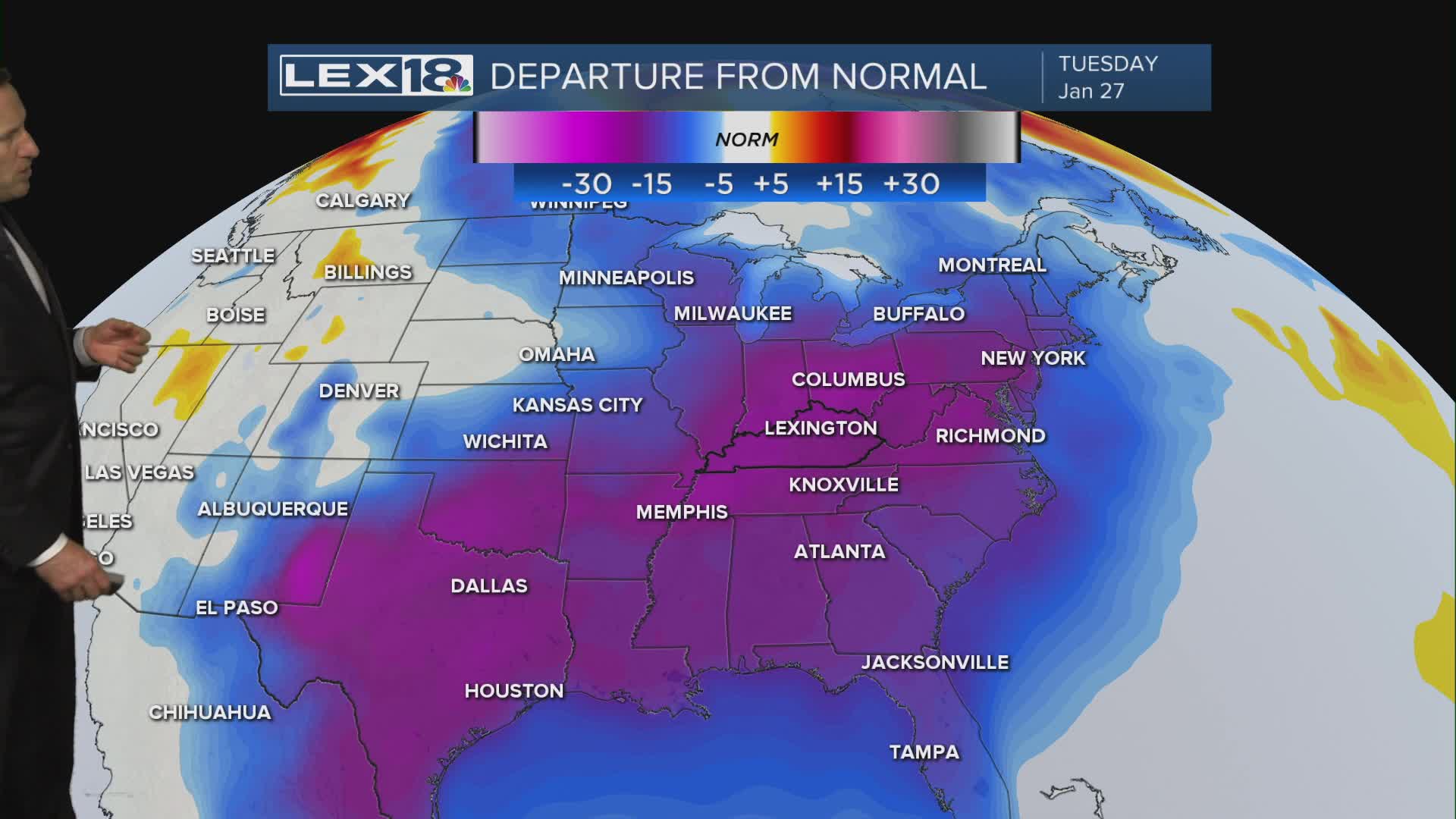 The deep freeze continues Tuesday with highs in the mid 20s in the Bluegrass and closer to 30° southeast. We'll see increasing clouds as another cold front approaches. This time, moisture is limited so expect flurries and isolated snow showers through the afternoon and evening. A gusty SW/W wind will keep a wicked, subzero wind chill going. That wind could also bring down ice laden branches (especially southeast) that could lead to additional power outages. A cold weather advisory remains in effect. Behind the front clouds break Wednesday but colder air will keep flowing, highs will struggle to hit 20° and with a continued N/NW wind we'll see teens Thursday through Saturday with near record lows below zero.