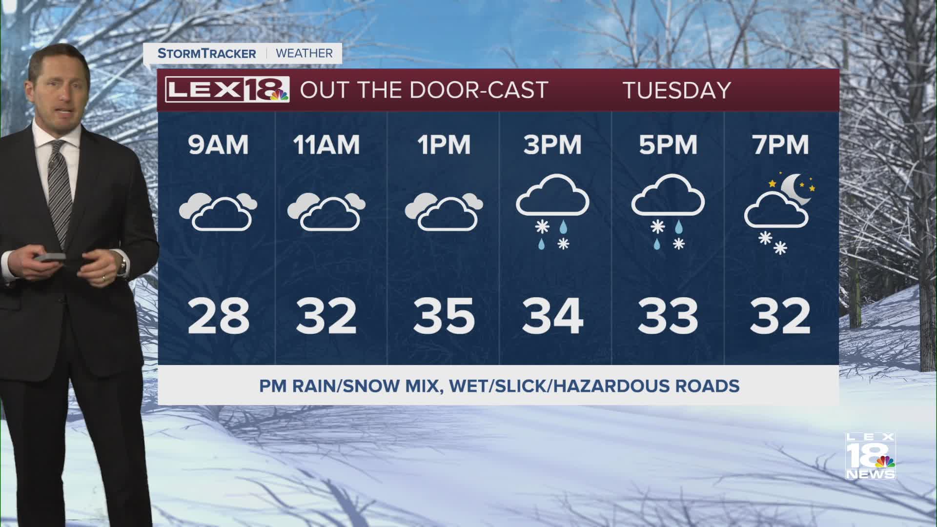Low pressure spins across the Commonwealth Tuesday, heaping another round of wet and wintry misery on top of what's already been an exceptionally dreary run of winter days. Expect cloudy skies with highs in the mid to upper 30s in the Bluegrass and low 40s south. That temperature setup at the surface means a rain and snow mix with a low chance for light freezing rain for a few hours as well. The main wave will hit Tuesday afternoon and wind down in the evening with a slushy couple of inches of snow possible north of I-64 with lower totals to straight rain as you head south. Roads that are still a mess will become wet, slushy, and even slicker. Stay weather aware and use extreme caution, especially on the evening commute. A winter weather advisory is in effect from Lexington, north until early Wednesday morning. We'll drop back below freezing overnight and stay in the upper 20s midweek, so everything will refreeze.